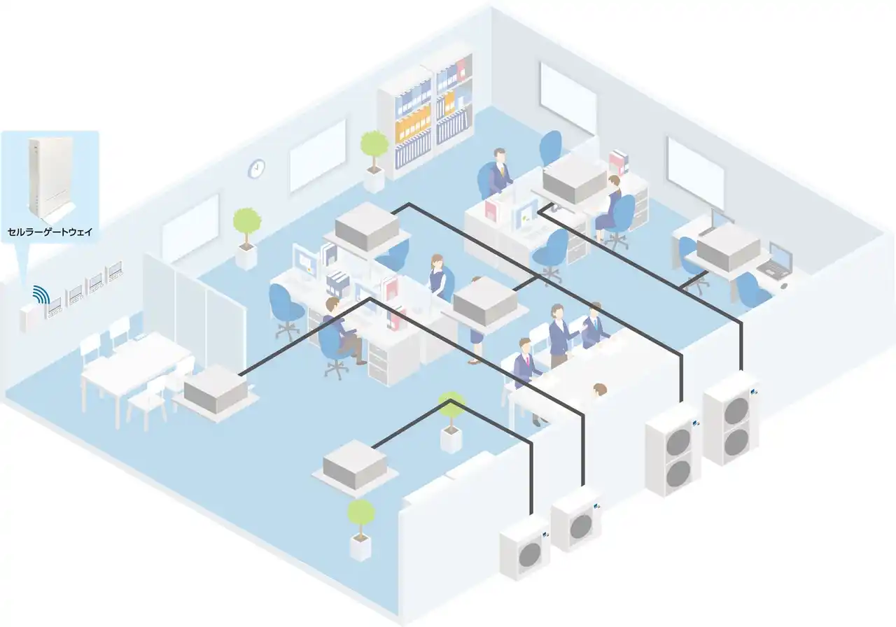 ・別売の通信機器「セルラーゲートウェイ」と当社製ワイヤードリモコン「MAスマートリモコン」を接続するだけで遠隔管理システムの利用が可能(※7)、「MAスマートリモコン」を最大6台まで連携でき、遠隔で空調機の異常通知や冷媒漏えい診断により保守管理業務を効率化 |