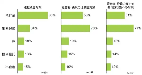運転資金は「預貯金」中心 (86%)である一方、退職金 (生命保険70%)・死亡/要介護(生命保険77%)は「生命保険」が最多です。 |