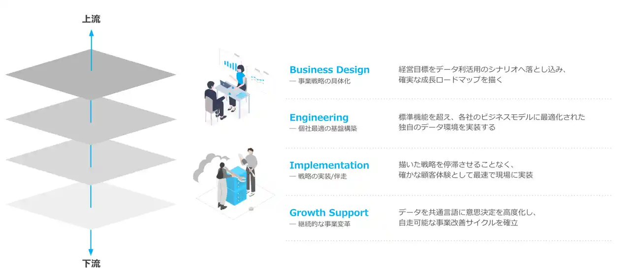 そこで、使いやすいプロダクトの提供に加え、上流の戦略立案から、専門的なデータ設計/構築、そして下流の実務実行までをトータルで支援する体制を構築しました。これにより、一貫性のあるデータ利活用を実現し、顧客のビジネス成長を加速させます。 |