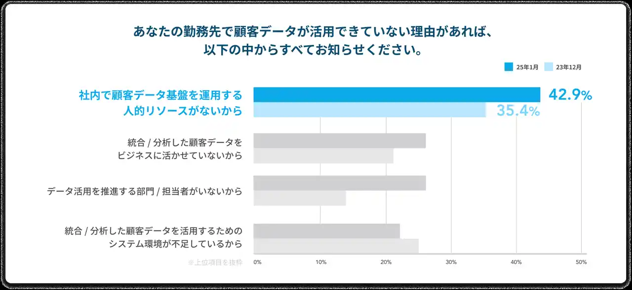 現在、マーケティング施策の高度化が進む一方で、多くの企業において、戦略を形にするための「データ設計/構築」や、施策を継続するための「運用実務」を自社で完結させることが困難になっています。最新の動向調査(※1)によると、データ活用が進まない最大の理由はツールの機能不足ではなく、「社内で運用する人的リソースが足りない(42.9%)」ことであり、戦略を描けたとしても、それをシステムへ実装し、PDCAを回し続けるための「専門性」と「リソース」の両面で、多くの企業が限界を感じている実態があります。 |
