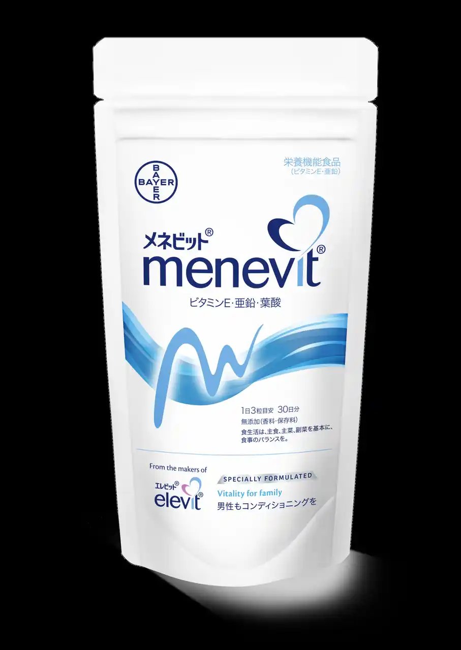 「メネビット(R)」は、プレナタル**サプリメント「エレビット(R)」シリーズから生まれた男性用サプリメントです。抗酸化作用を持つ栄養素として代表的なビタミンEや、コンディショニングに大切な細胞の代謝をサポートするミネラルの亜鉛など、男性の妊活を支える9つの栄養素をバランスよく配合したマルチビタミンサプリメントとなっています。 |