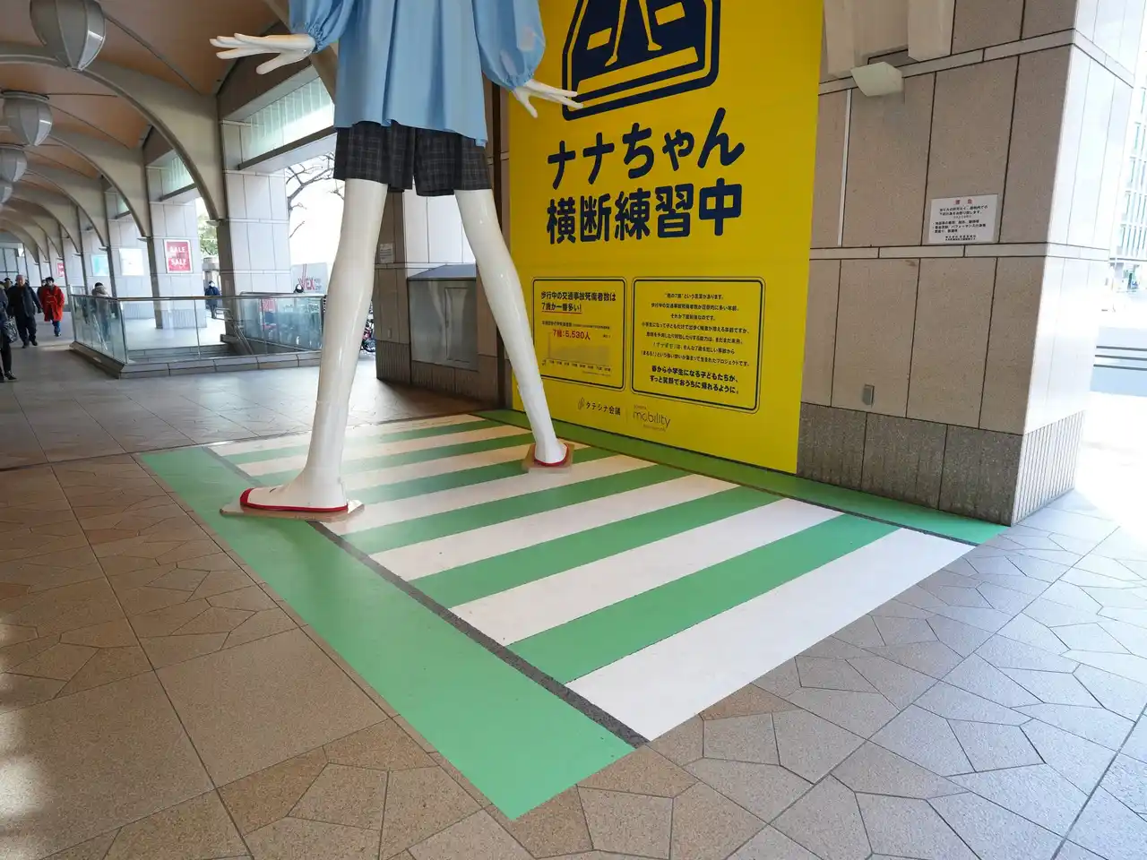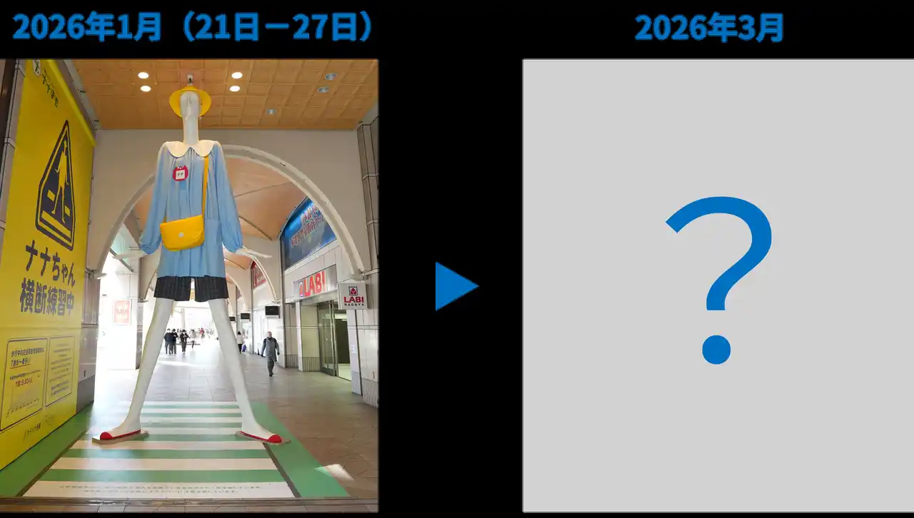 2026年1月21日(水)から1月27日(火)までの1週間、4月の入学前の備えを呼びかける目的で、ナナちゃん人形が「横断歩道を渡る練習をする園児姿」に変身します。 |