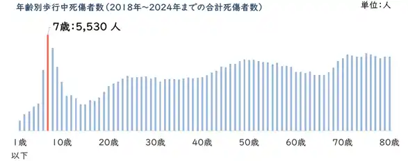 交通事故総合分析センター(ITARDA)のデータからの累計(2018-2024年)によると、歩行中の事故死傷者数が最も多い年齢が「7歳」となっており、小学3年生頃に該当する9歳頃までの事故死傷者数が突出しています。 |