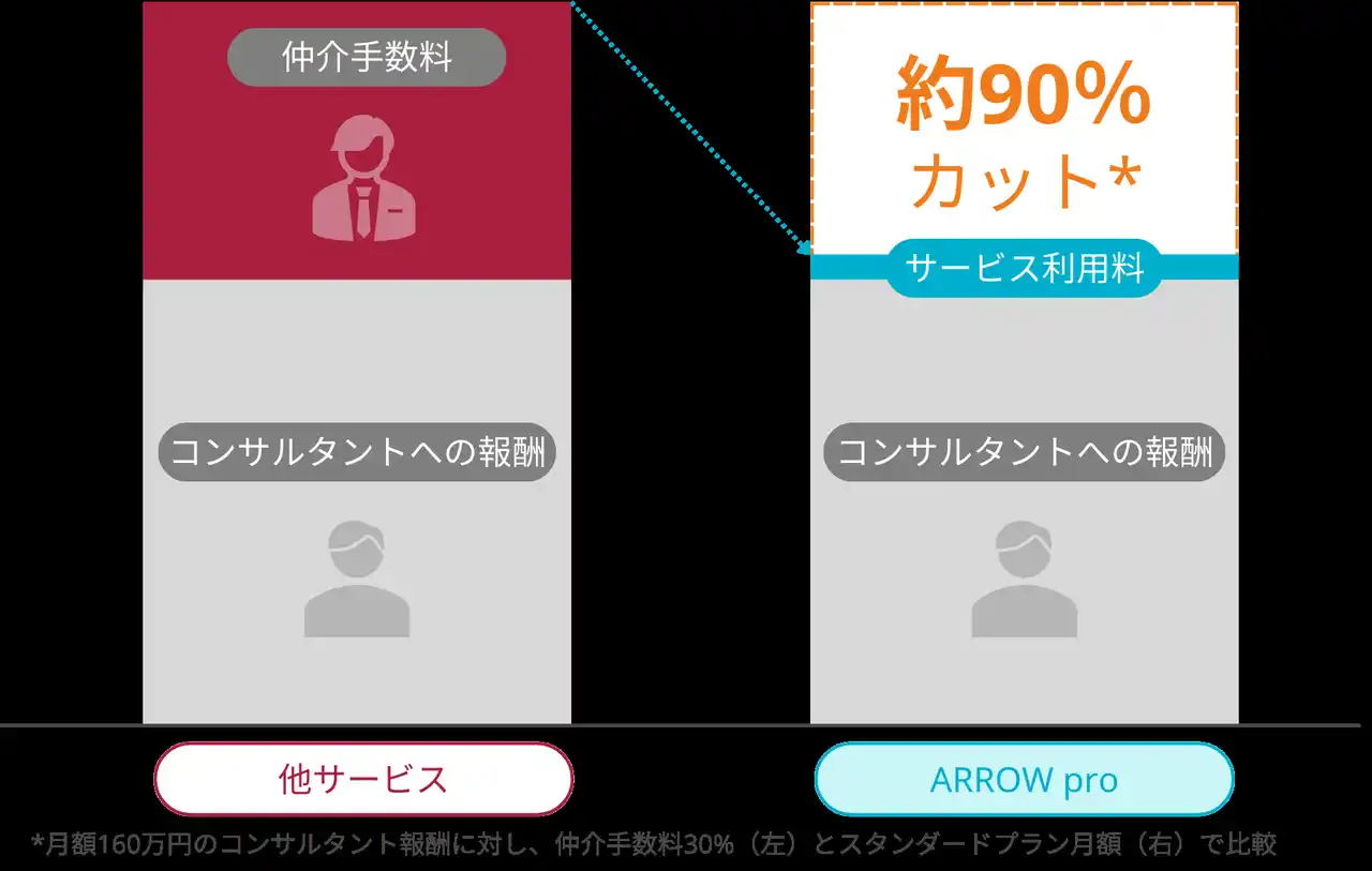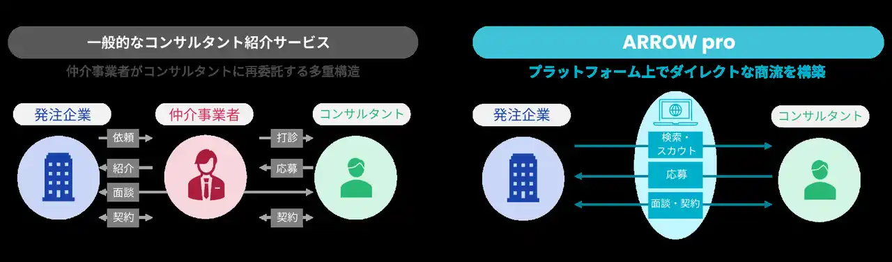 当社は、大手戦略・総合コンサルティングファーム出身者の原体験に基づき、これらの構造的な課題を解消し、企業とコンサルタントにとってよりシンプルで透明な選択肢を提供するため『ARROW pro』を開発しました。 |