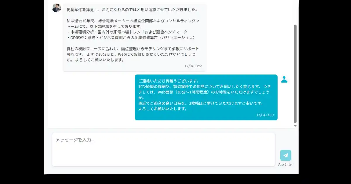 メッセージ機能に加え、一般的なマッチングプラットフォームで制限されがちな「契約前面談」も自由に行え、ミスマッチを未然に抑止できます。 |