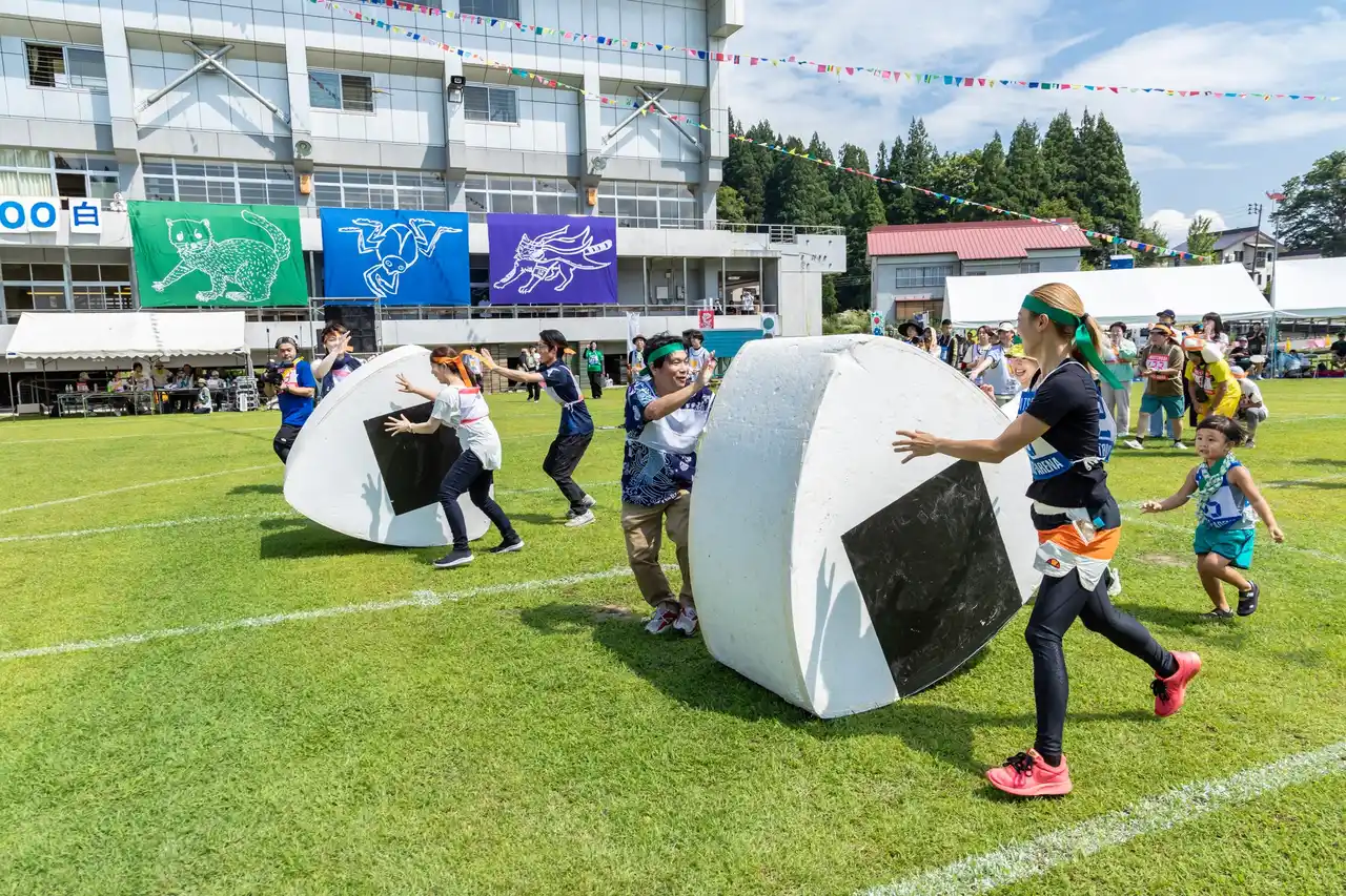 その理念のもと地域に実装された「大地の運動会」は日本独自の運動会を再解釈し、多様な人々が身体を通して交流する場をつくり出している。在住の外国人を含む多様な人々が同じチームで競技し、応援し、食事を共にし、互いの息づかいを分かち合う時間は、共に生きる感覚を身体で実感できる特別な体験であり総合芸術活動である。 |