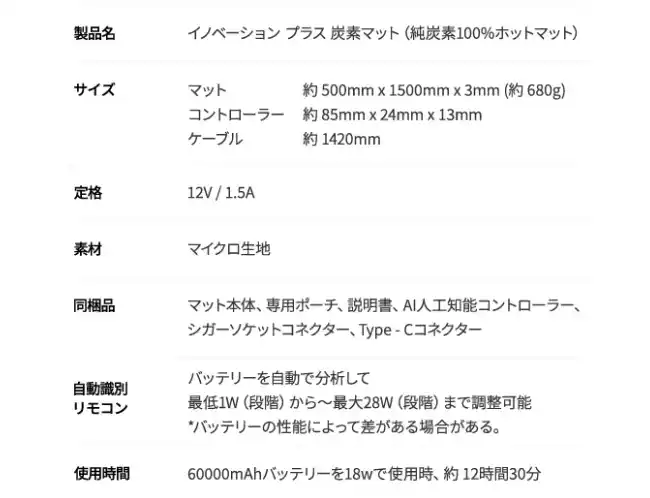 温度設定18wで使用時、60000mAhバッテリーで約12時間30分の使用が可能!消費電力が抑えられます。 |