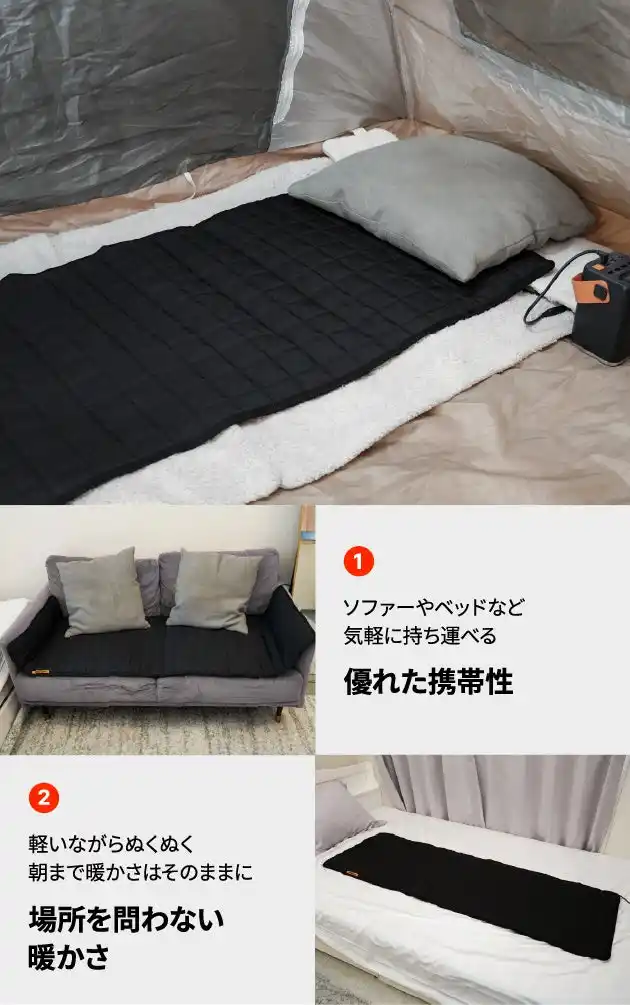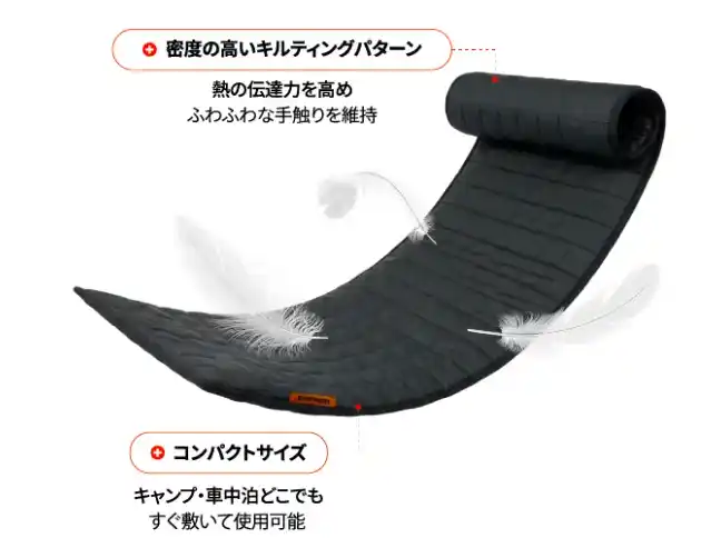 車やテント、ベッド、ソファー、コットなど場所を問わず使える便利なUSBホットマット |