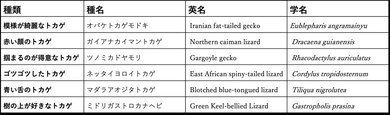 ○ 6F「GREEN ROOM」のトカゲ展示で観察できる種類 |