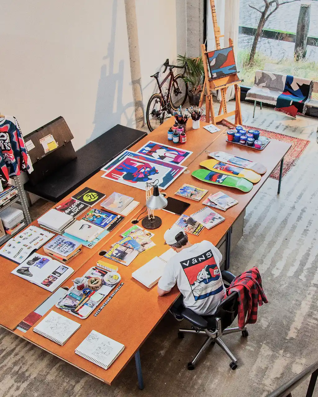 Parraは1990年代初頭にプロスケートボーダーとして活動を開始し、Vansのチームライダーとしてサポートを受けていました。その大胆かつシュールなアートワークが世界中のギャラリーやミュージアムコレクションで高い評価を得るようになった現在、両者の歴史が一周し、今回のコラボレーションが実現しました。 |