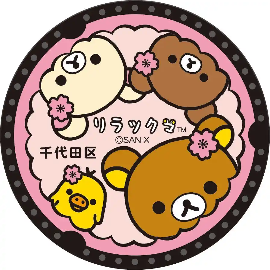 リラックマたちと区の花さくらを組み合わせたデザインマンホールそっくりのマグネットが新登場! |