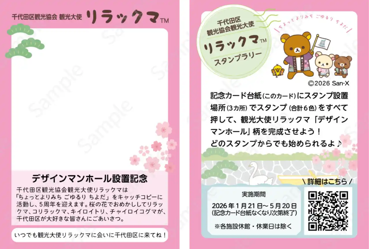 デザインマンホールの設置を記念して、記念スタンプラリーを開催します。記念カード台紙にスタンプを押して、リラックマのマンホール絵柄を作成いただけます。千代田区観光案内所、KANDA SQUARE、テラススクエアの3施設を回っていただき、合計6色のスタンプを押すと記念カードが出来上がります。 |