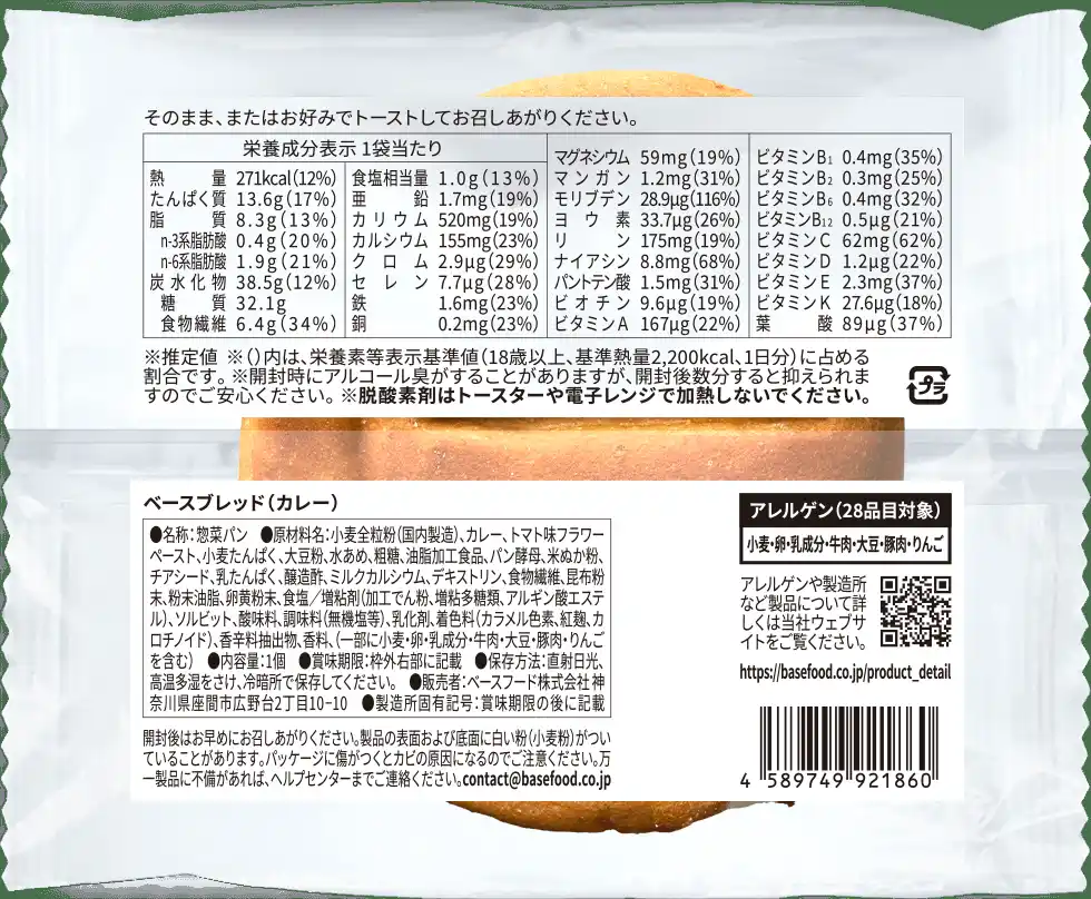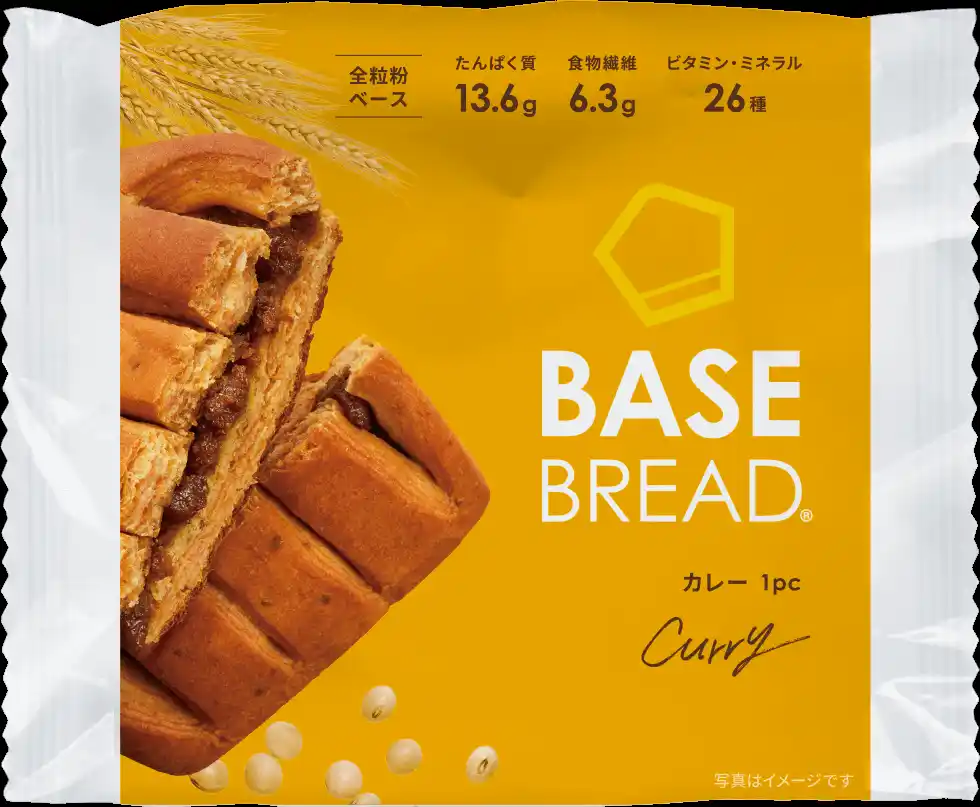 | 「かんたん・おいしい・からだにいい」をコンセプトに、1食(2袋)で1日に必要な33種類の栄養素の1/3がバランスよくとれる「BASE BREAD」シリーズ。「BASE BREAD カレー」は「食事感のあるラインナップがほしい」「甘いパン以外の選択肢を増やしてほしい」という声を受け、2021年2月にBASE BREADシリーズの総菜パン第一弾として発売後、2023年9月に大型リニューアル。炒め玉ねぎの甘みをベースにしたスパイスが効いたカレーを、全粒粉や大豆を使用した生地で包んだ「揚げない」ベイクドカレーパンは、ヘルシーなのに満足感ある味わいのカレーパンとして人気の高い商品です。さらに、独自の水分コントロールや製法、原材料に酢を使用するなどの工夫により、総菜パンの常識を破り、常温で約1ヶ月の保存を可能にしたロングライフパンです。 | ||||||||||||||||||||