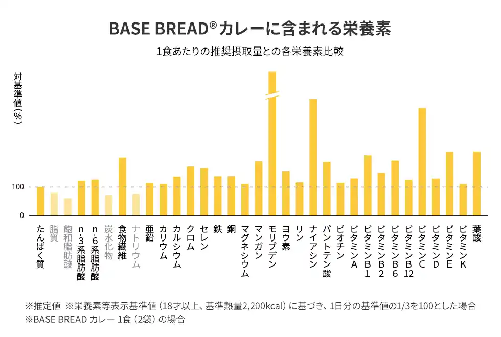 | *1 1食分(BASE BREADは2袋、BASE Cookiesは4袋、BASE YAKISOBAは2個、BASE RAMENは2個、BASE Pancake Mixは1袋と卵Mサイズ1つ、牛乳(成分無調整)100mlを使用して調理した場合)で、栄養素等表示基準値に基づき、脂質・飽和脂肪酸・炭水化物・ナトリウム以外のすべての栄養素で1日分の基準値の1/3以上を含む。 | ||||||||||||||||||||