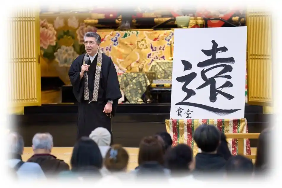 築地本願寺の恒例の行事として、年初に宗務長が選んだ今年の漢字を揮毫する行事があります。2026年、私は「遠」という字を選びました。目まぐるしく変化する現代において、私たちは何かと短期的な視点で物事を捉えがちです。たとえば若者に『ひと昔前とはどれくらいの期間をさすか』と聞くと、「5年」、なかには「3年」と答えている人もいるそうです。 |