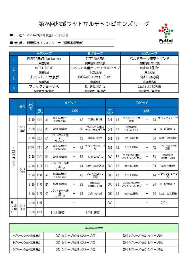 【一般財団法人日本フットサル連盟】 【第26回地域フットサルチャンピオンズリーグ】組合せおよび試合スケジュール公開のお知らせ