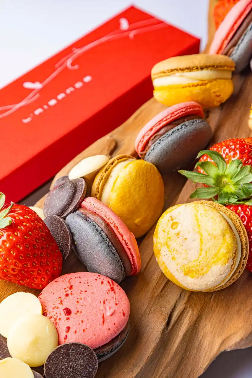 〈福井市/レゾンス〉西武福井店限定 バレンタイン マカロンセット[ICHIGOOJI×クロモジダークチョコ、紅映梅×はちみつホワイトチョコ](2種・計5個入、1箱)・・・2,601円 |