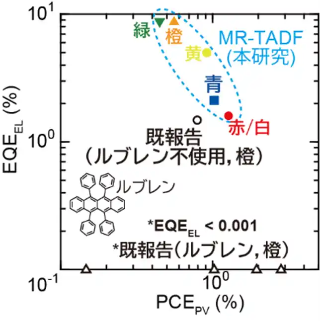■研究の背景 有機半導体は、薄く、軽く、柔軟であるという優れた特性に加え、多彩な光機能を持つため、次世代の電子デバイスとして活発に研究されています。実際に、高い発光効率を活かした「有機EL(OLED)」はスマートフォンなどのディスプレイとして広く普及し、一方で高い吸光度を活かした「有機薄膜太陽電池(OPV)」の開発も進められています。 しかし、これら「発光」と「発電」という二つの機能を一つのデバイスに統合しようとすると、深刻な効率低下の問題に直面してきました。 これまでの研究では、光吸収に優れた「ルブレン」が光吸収・発光材料に用いられていました。この場合、電力変換効率(PCEPV、発電効率)は最大約3%が得られますが、EL発光の外部量子効率(EQEEL)はわずか0.001%以下でした(図2:黒△)(参考文献1)。ルブレンを用いた素子ではEQEELの抜本的な向上が困難であるため、ルブレン不使用の素子も報告されていますがPCEPV/EQEELはともに1%程度が最大でした(図2:黒〇)(参考文献2)。また、これまでは動作する色が橙色などの長波長領域に限られており、フルカラー化が困難である点も応用への大きな障壁となっていました。 |