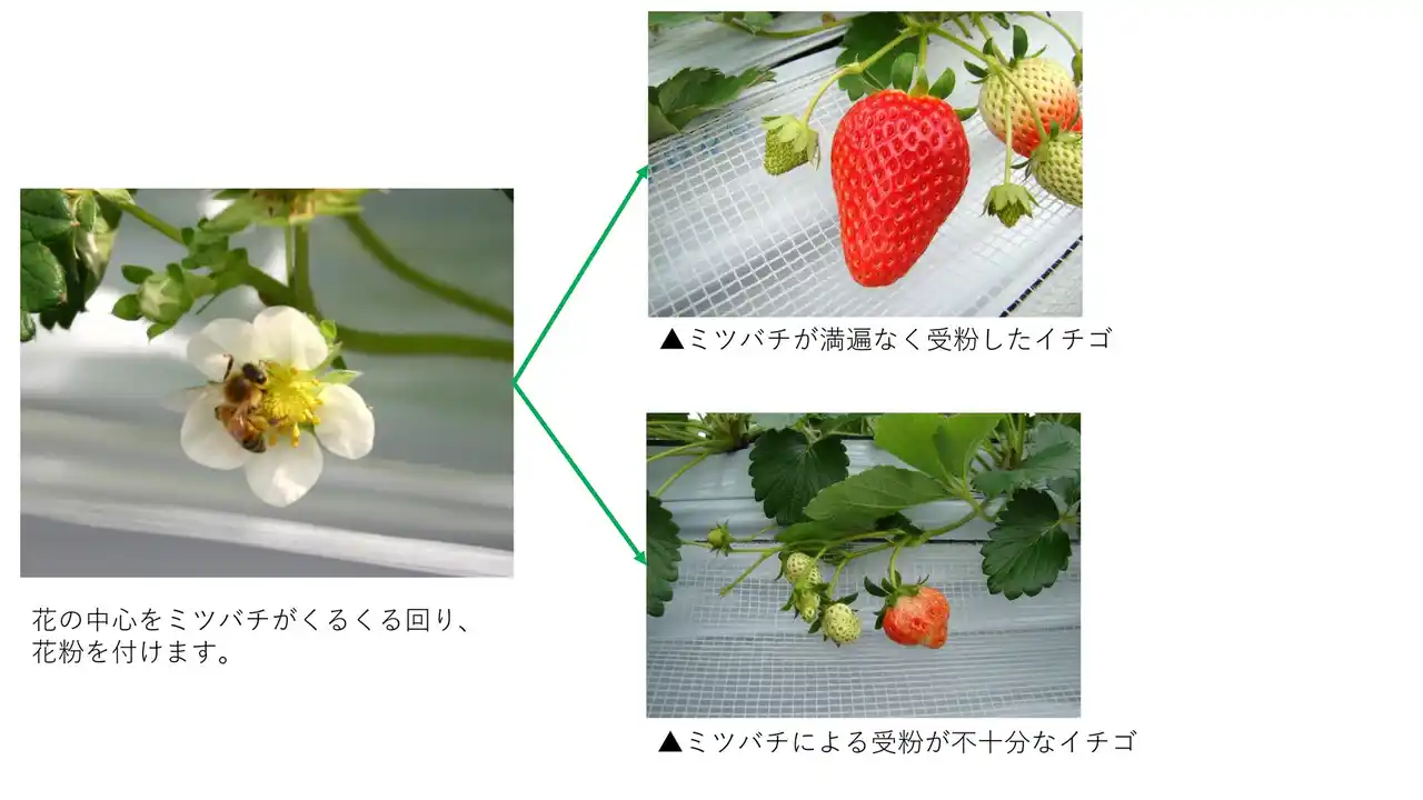 こうしたミツバチの働きを少しでも多くの方に知っていただくため、イチゴ狩りという体験を通じ、自然環境におけるミツバチの働きを学びながら楽しめる施設を運営しています。 |