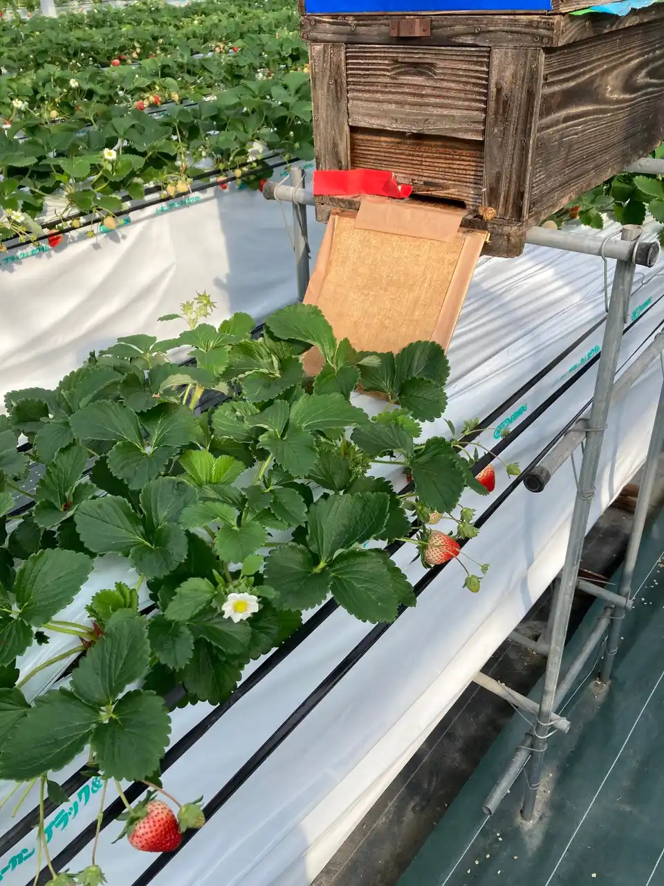 当園では、イチゴはもちろん、ハウス内のミツバチを養蜂のプロが日々管理しています。巣箱内のミツバチの数や状況を丁寧に確認し、ミツバチがストレスなく生活できる環境を整えることでイチゴの受粉をサポートしています。 |