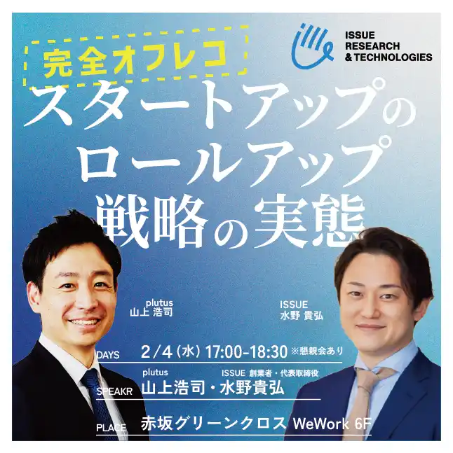 その第一弾として、2026年2月4日(水)、スタートアップの成長戦略として注目される「ロールアップ戦略」の核心に迫るCEO限定セミナーをPLUTUS GROUP(本社:東京都千代田区、代表取締役社長:野口真人)と共催いたします。 |