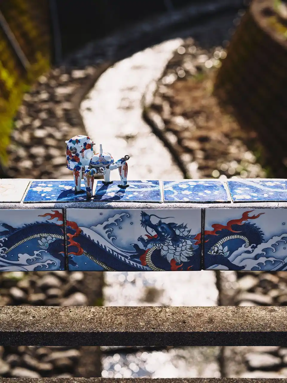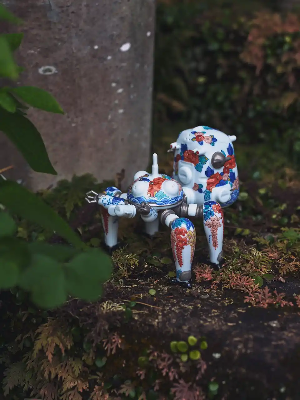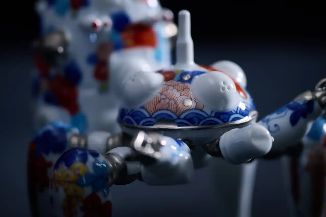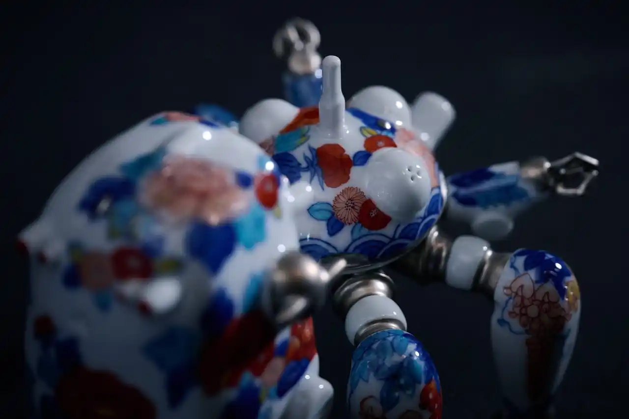 2025年、鍋島焼は開窯350年を迎えました。351年目の新たな幕開けとなる「タチコマ鍋島焼」は、“伝統×デジタル”が交差する革新的な挑戦でした。将軍家献上品として磨かれた鍋島焼の神髄は“極めて精緻な手仕事”にあります。 一本一本の生きた線、息づかいを感じる筆運び、澄んだ呉須のグラデーション。これら全てに職人の技術と経験を注ぎ込みました。タチコマの放つ生命感を、伝統技術でいかに表現するか。224Porcelainの卓越した造形に対し、畑萬陶苑は持てる最高の技で応えました。造形の力強さと絵付の精密さが生む「品格と臨場感」。そこに鍋島様式特有の「層(レイヤー)の奥行き」を調和させています。 |
