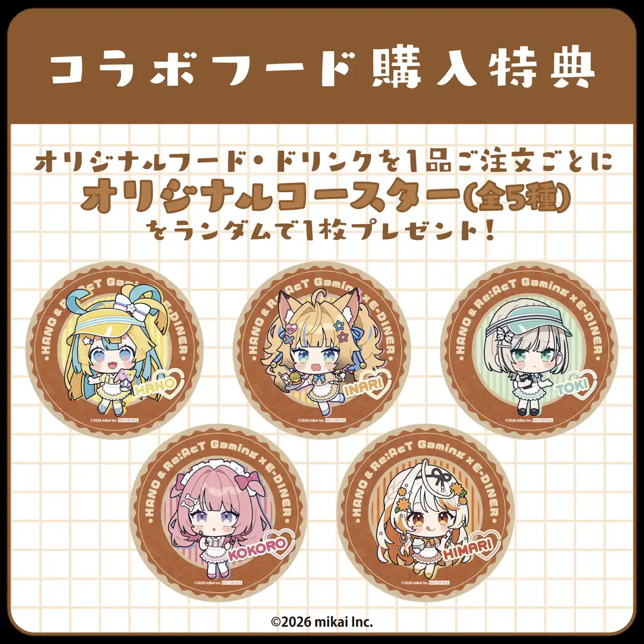 オリジナルフード・ドリンクを1品ご注文ごとに「コースター (全5種)」からランダムで1枚プレゼント。 |
