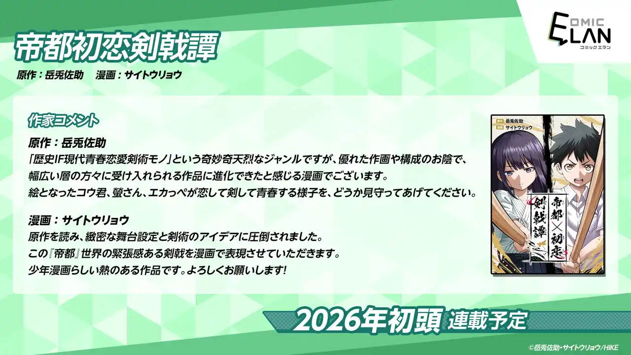 株式会社HIKE(本社:東京都新宿区、代表:三上 政高、以下「HIKE」)の電子漫画出版事業を担う「HIKE編集部」は、少年/青年向け作品を中心に扱うレーベル「COMIC ELAN」(コミックエラン)の第一弾として、『帝都初恋剣戟譚』(ていとはつこいけんげきたん)を連載開始予定です。本作品は「歴史IF×青春×剣戟」アクションで、日本最大級の小説投稿サイト「小説家になろう!」にて2023年9月より連載中の同名作品のコミカライズです。正式な配信開始日、配信プラットフォームは後日発表をお待ちください。