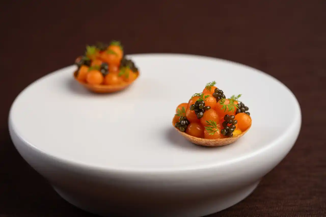 バターでしっかりと火入れされたにんじんのピュレがもたらす香ばしさに、キャビアの塩分とサクッとしたタルト生地の食感が重なり合います。 |