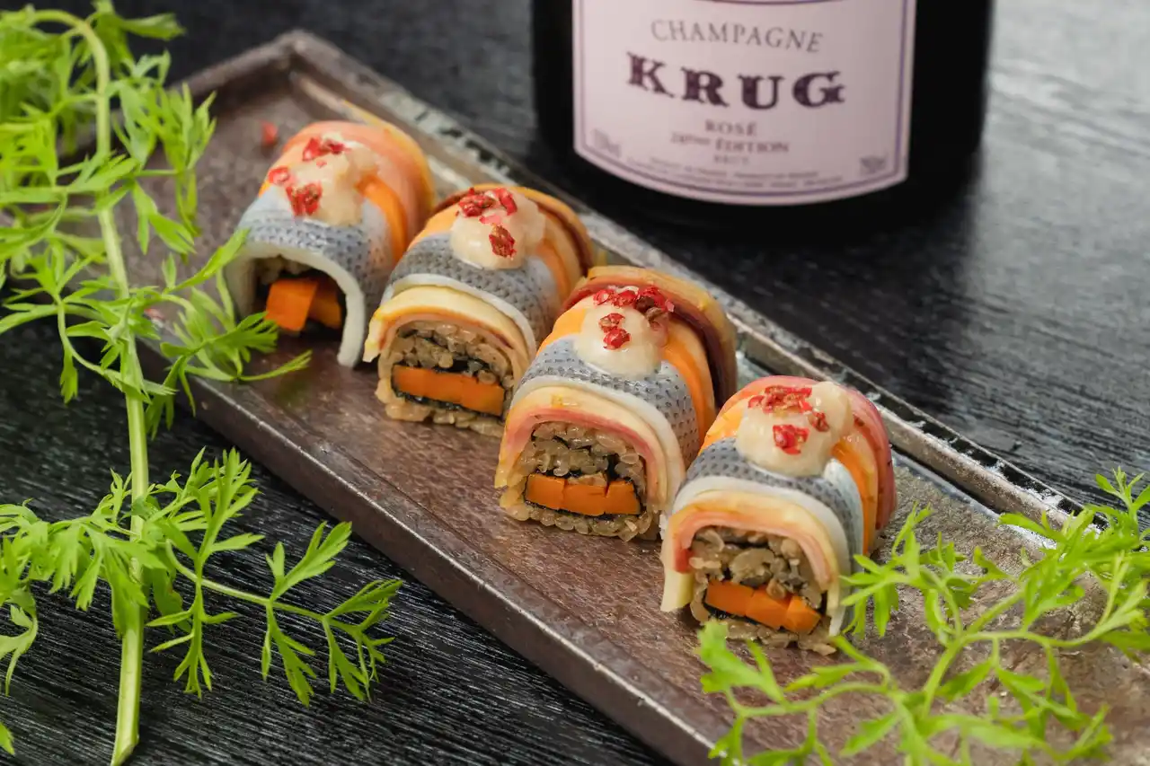 重すぎない柑橘系オレンジのニュアンスに、スミレを思わせるはちみつのタッチの【甘】、そして心地よい熟成香が、クリュッグ ロゼの魅力を形づくっています。料理は、砂糖を使用せず赤酢のみで構成した酢飯による【酸】と、自然由来の発酵を取り入れ、麹を活用することで引き出された【甘】が特徴です。それぞれの【甘】と【酸】のキャラクターが重なり合うことで、シャンパーニュの核となるほのかな熟成香が際立ち、全体の印象に上質な奥行きをもたらします。 |