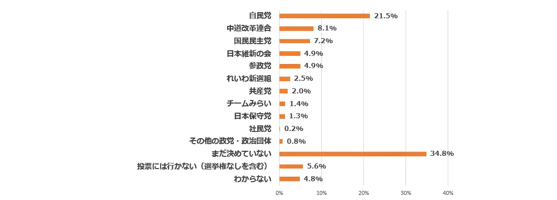 比例投票先は自民21%、中道8%、国民7%、維新4%、参政4% |