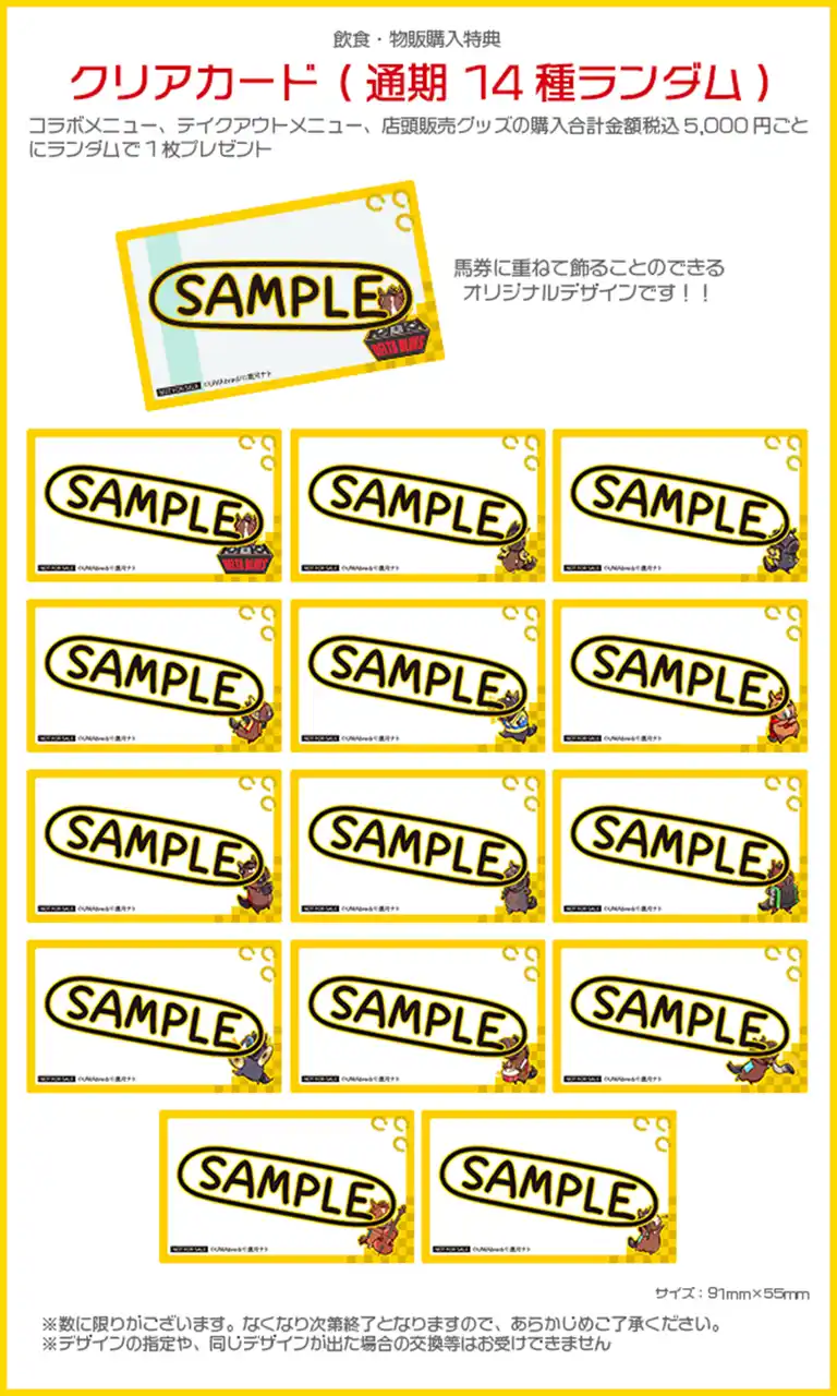 | コラボメニュー・テイクアウトメニュー・店頭販売グッズの購入合計金額5000円ごとにランダムで1枚クリアカード(14種・ランダム)をお渡しします。 | |||||||||