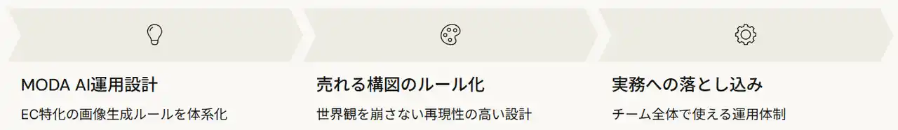antiqua.aiでは、Moda AIを前提とした画像生成設計、売れる構図・世界観のルール化、そしてEC運用に落とし込むための再現設計を一体で構築しています。 |