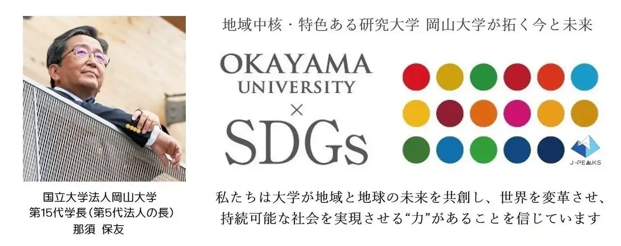 | 国立大学法人岡山大学は、国連の「持続可能な開発目標(SDGs)」を支援しています。また、政府の第1回「ジャパンSDGsアワード」特別賞を受賞しています。地域中核・特色ある研究大学として共育共創を進める岡山大学にご期待ください | ||||