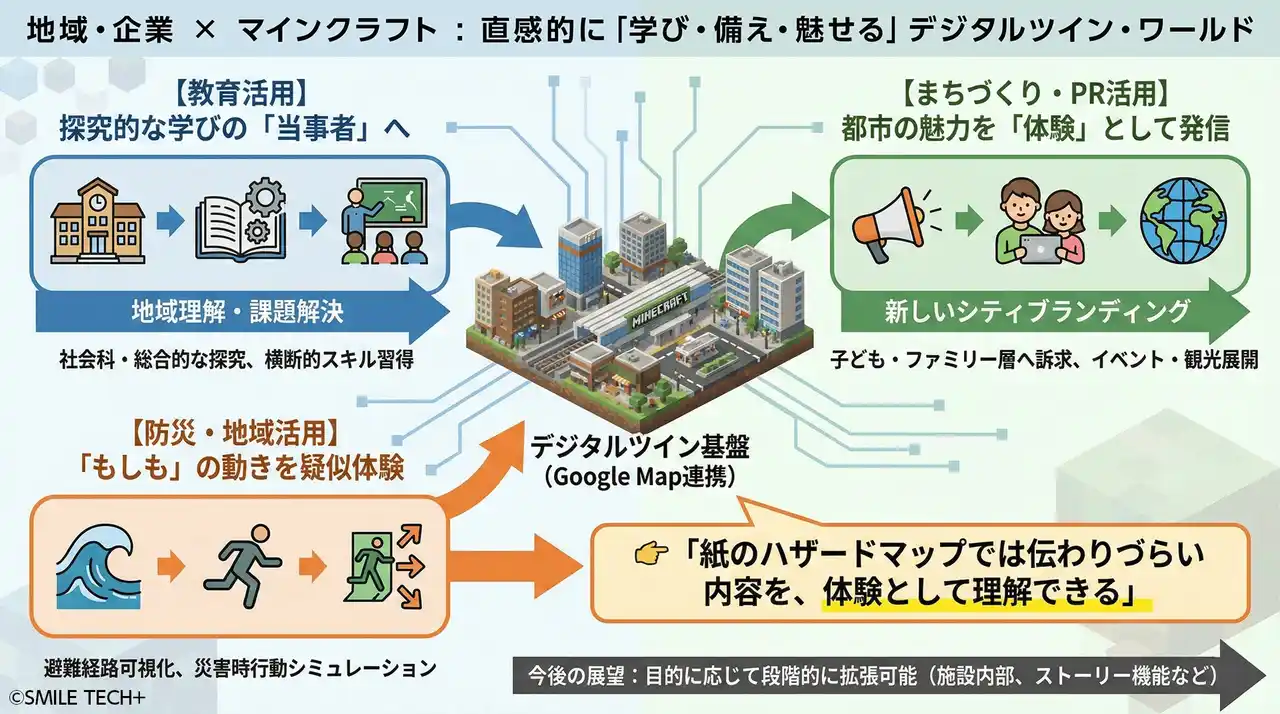 SmileMe株式会社(教育ブランド:SMILETECH+)は、Minecraftを活用し、 自治体・企業・地域コミュニティの拠点や観光資源、施設を仮想空間上に再現する取り組みを本格的に開始しました。 |
