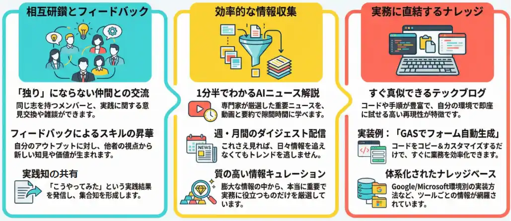 | 本コミュニティは、大手企業のDX・経営企画リーダーが実務上の課題を解決し、互いの知見を「集合知」として蓄積するプラットフォームです。以下の3つの柱を中心に、実務に即応した価値を提供します。 | ||||||||||||