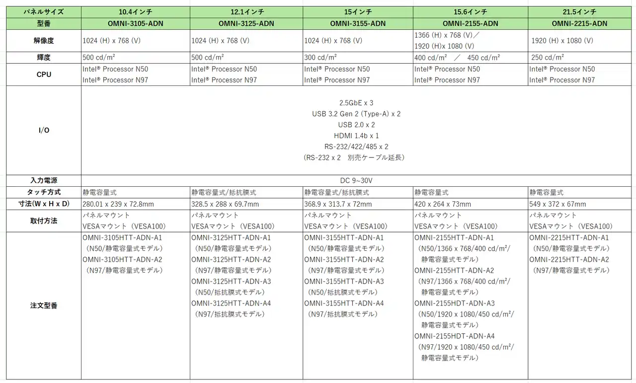 AAEON社はIntel(R) N50/N97(Alder Lake)搭載した産業用タッチパネルPC【OMNIシリーズ】の販売を開始しました。10.4インチから21.5インチまで様々なパネルサイズをご用意し、ファンレス構造で、フロントパネルは防水防塵IP65クラスに準拠しております。パネルマウント/VESA100取り付け可能で、DC9~30V入力に対応した製品です。 |