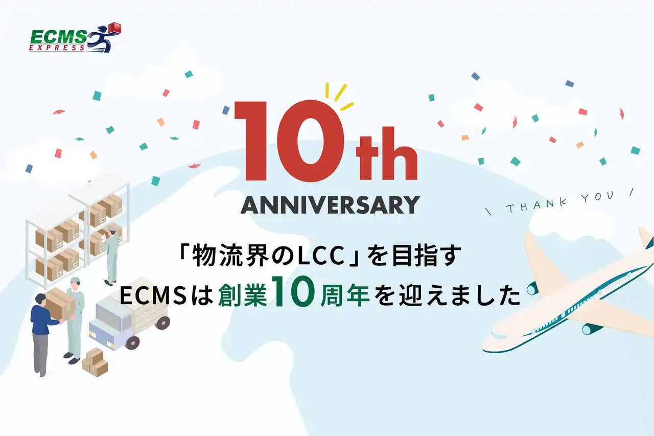 | 株式会社ECMSジャパン(本社:東京都中央区、代表取締役社長:小松英樹)は、2026年1月に創業10周年を迎えたことをお知らせいたします。これまで支えていただいたお客様、パートナー企業、関係者の皆様に深く感謝申し上げるとともに、越境EC物流の低コスト・高品質・シンプルなサービス提供を通じて、これからも「物流界のLCC」として価値創造を続けてまいります。 | |||||||||||||
