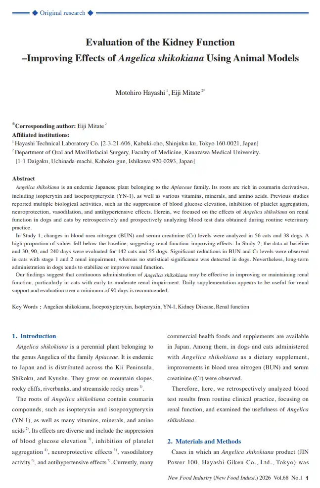 | 林技研株式会社(本社:東京都、代表取締役:林 基弘)が運営する「JIN活研究所」は、犬・猫の腎臓機能に関する研究の一環として取り組んできた植物素材「イヌトウキ」に関する研究成果が、査読付き学術誌『New Food Industry』2026年1月号に論文として掲載されたことをお知らせします。 | |||