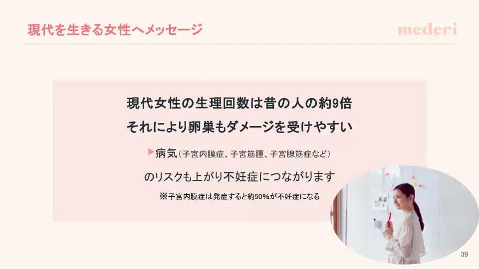 年齢と妊娠率の関係や、不妊治療の実態、定期的な婦人科検診の重要性について触れ、「将来の選択肢を守るために、今できること」を考えるきっかけを提供しました。 |
