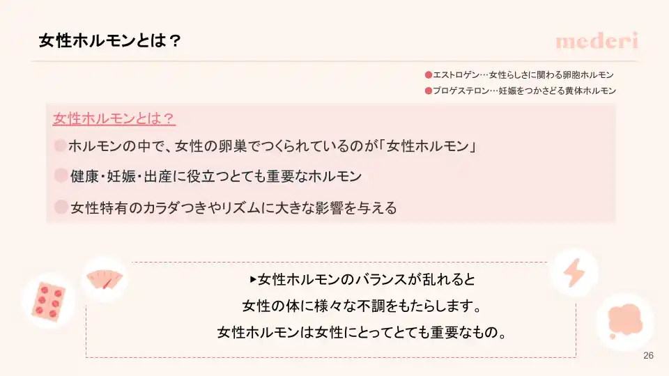 女性ホルモンは、健康、妊娠、出産に役立つホルモンで、女性特有の体つき、発達、生活リズムに大きく関わる重要な存在です。 |