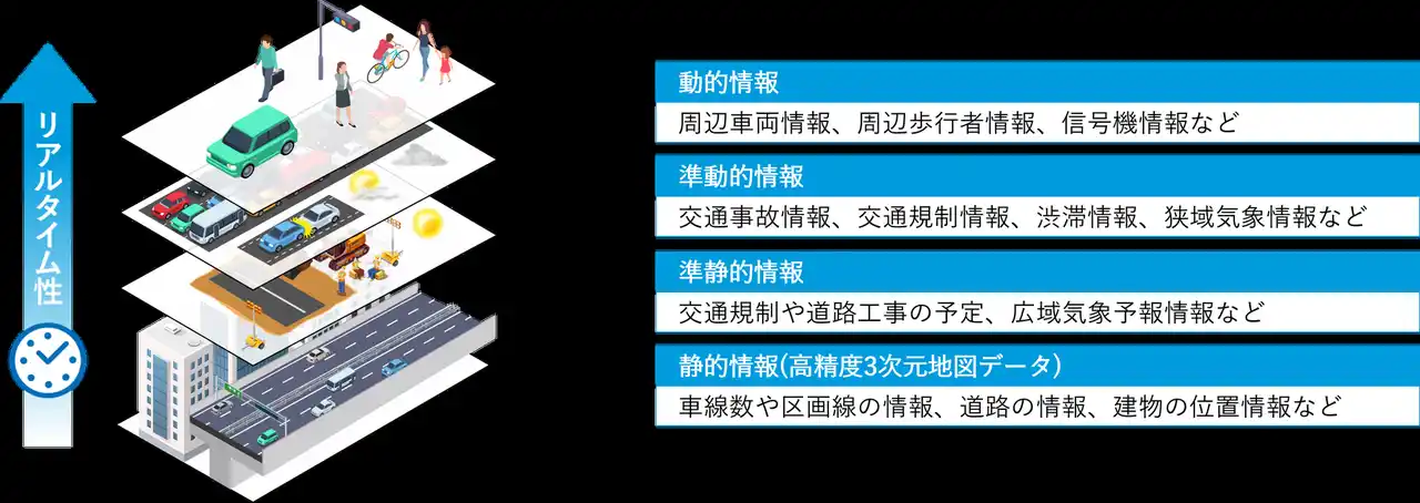 ※1 ダイナミックマップ情報:工事や故障車の停車などによる通行不可エリア等の静的情報や、航空機や車両の位置などの動的情報。情報のリアルタイム性ごとに静的・準静的・準動的・動的の4階層に分類された情報を持つ地図データベースである「ダイナミックマップ」を構成する情報 |