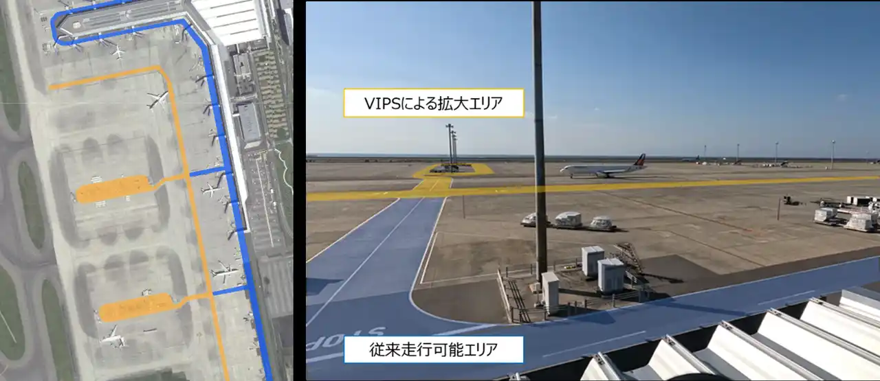 「VIPS」による空港内の自動運転可能エリアの変化 ※左図: 国土地理院撮影の空中写真(2010年撮影)を加工して作成 |