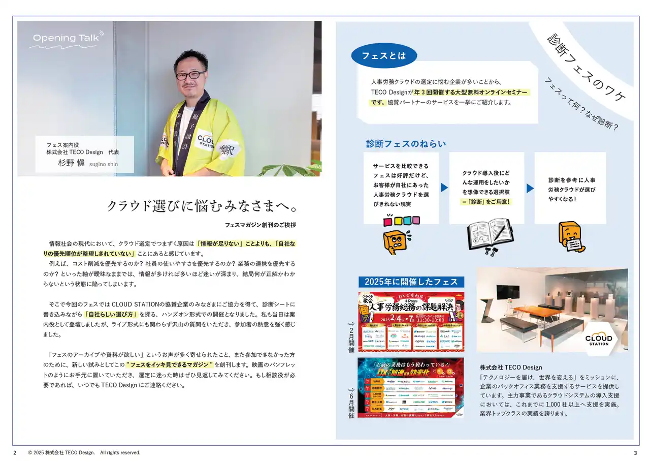 株式会社TECO Design(本社:東京都新宿区、代表取締役社長:杉野 愼)は、クラウド導入を検討する企業と最適なクラウドサービスの“ご縁”を結ぶオンラインイベント 「導入支援で円満!クラウド縁結びフェス2026」 を、2026年2月4日(水)~6日(金)の3日間にわたり開催いたします。 |
