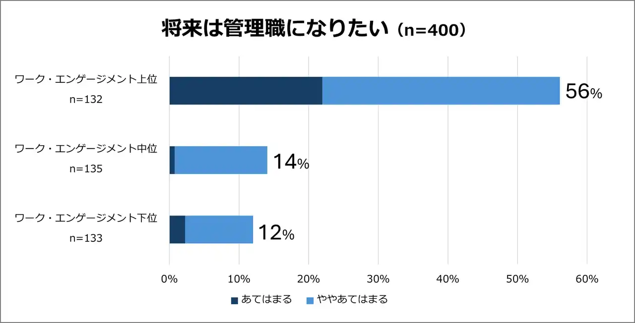 「将来は管理職になりたい」に対して「あてはまる」「ややあてはまる」と回答した割合は、ワーク・エンゲージメント上位では56%であるのに対し、中位14%、下位12%となりました。 |