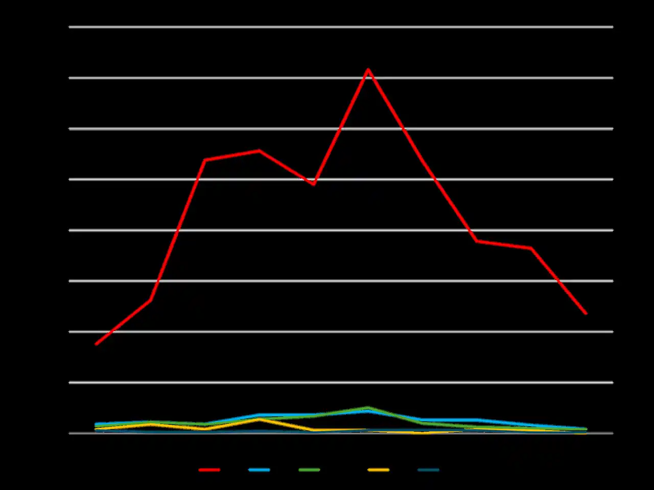 図4:メタンハイドレートに関連する論文の国別発表件数の年次推移(2015年以降) |