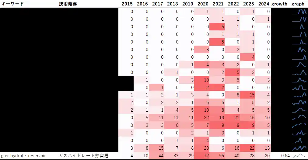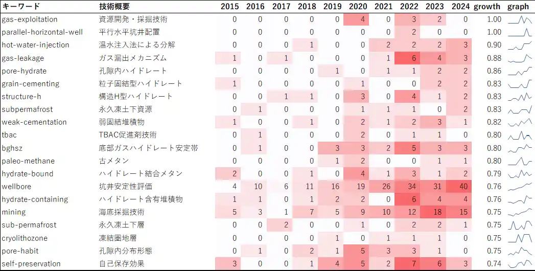分析の結果、「depressurization(減圧法)」、「self-entering(自動制御)」、「three-horizontal(3本水平坑井)」、「gas-exploitation(ガス採掘)」といった、掘削・生産関連のキーワードが増加していることがわかります。深海のメタンハイドレートの採取は、井戸を掘って圧力を下げる「減圧法」が基本です。このとき、自動制御システムによりガスの産出量や地層の安定性を監視し、効率的で安全な操業を実現しています。また、複数の水平坑井を配置することで、広い範囲からガスを効率よく回収する設計が重要です。 |