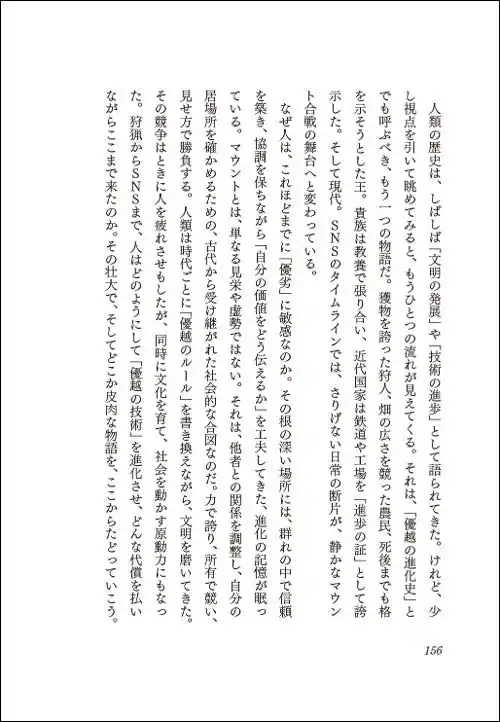 第3章では、人類史のマウントの起源をたどっていきます。遺伝子レベルで組み込まれた「生存本能」としてのマウント───「人類のルーツから現代へ」様々なマウントの歴史を紐解きます。 |