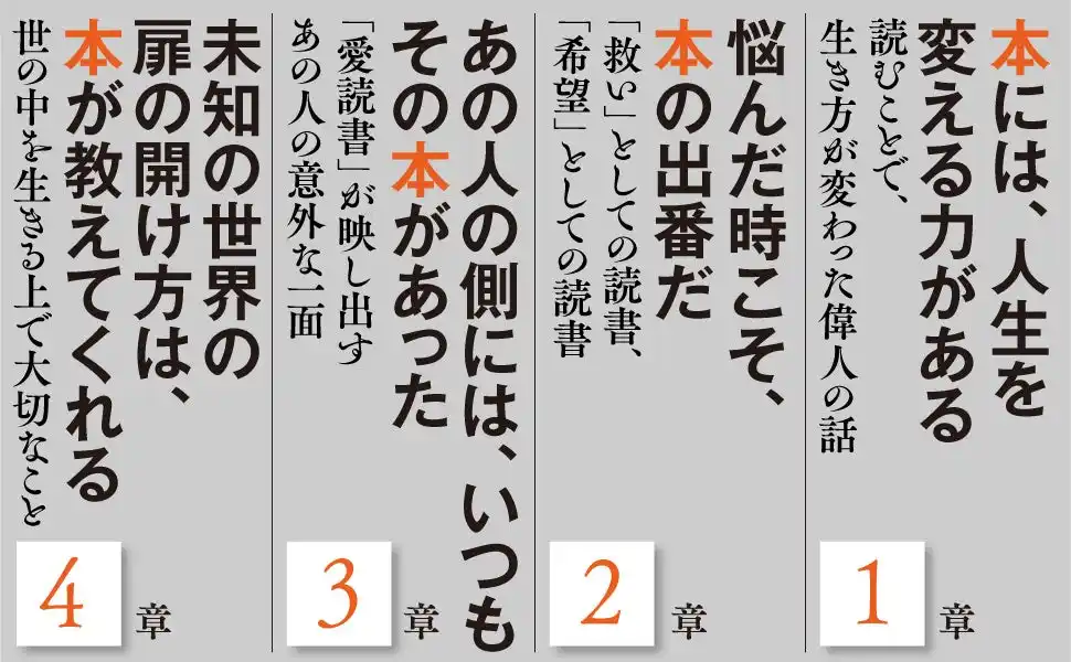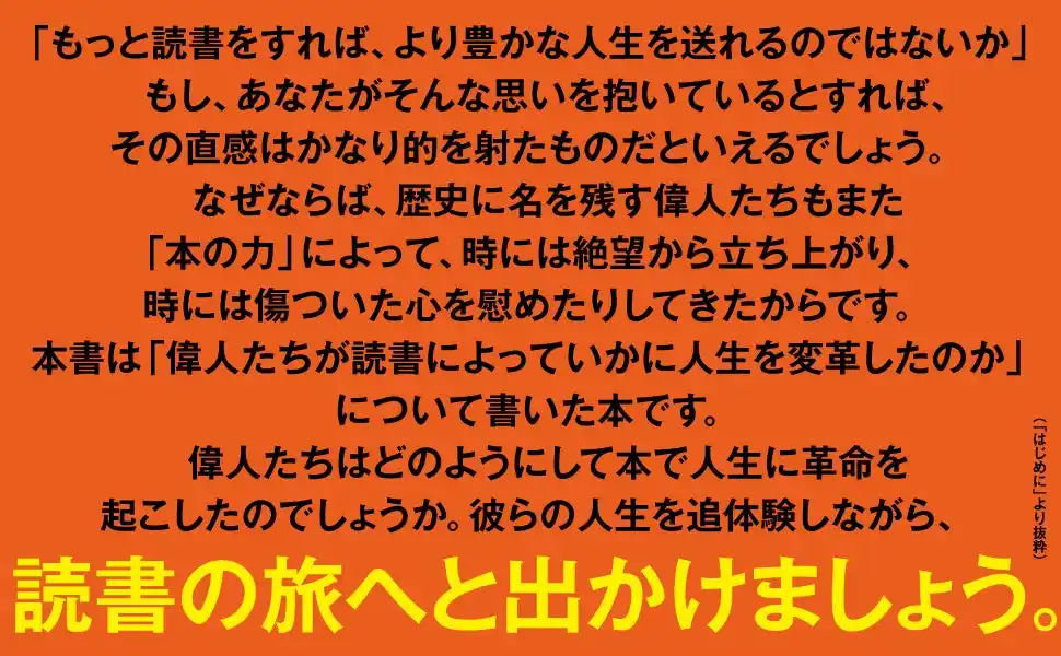 本との関係を通して、著名人たちの人物像に新たな角度から光を当てるのと同時に、古今東西の名著が持つ不変の哲学を読み解きます。本書は、「本が持つ力」を心の底から実感できる一冊です。 |