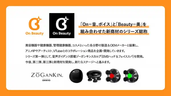 「On=音、ボイス」と「Beauty=美」を組み合わせた新商材のシリーズ総称。美容機器や健康機器、管理健康機器、コスメといった各分野の製造・OEMメーカーと協業し、アニメIPやアーティスト、VTuberとのコラボレーション商品を企画・開発していきます。シリーズ第一弾として、音声ガイダンス搭載ゾーガンキンスカルプ(EMSヘッド&フェイススパ)を開発。今後、第二弾、第三弾と新商材を開発し、新たなステージへと進みます。
